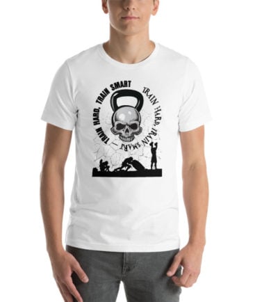 Short-Sleeve Unisex T-Shirt— Cavemantraining skull with slogan “Train Hard, Train Smart”